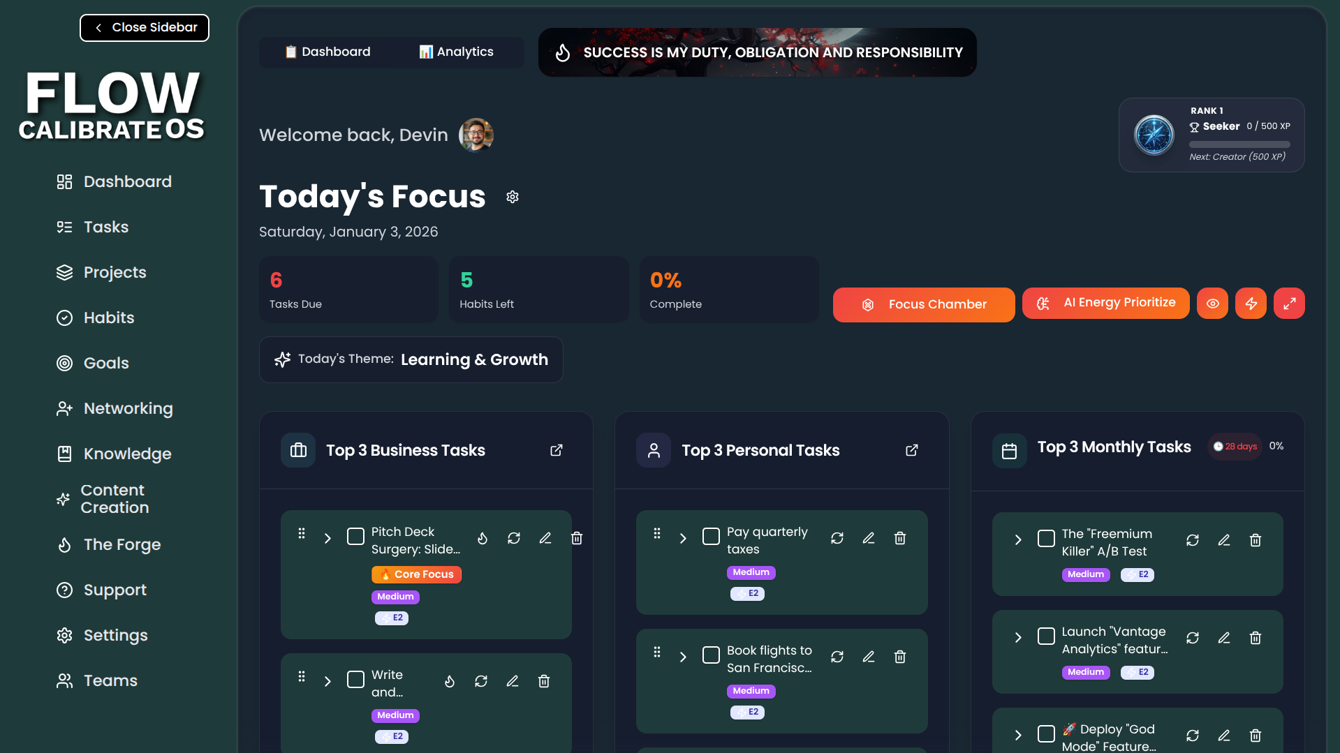 Flow Calibrate OS is the ultimate productivity and performance ecosystem — combining goal-setting, focus, habit tracking, business organization, and creative flow into one sleek, intuitive platform.